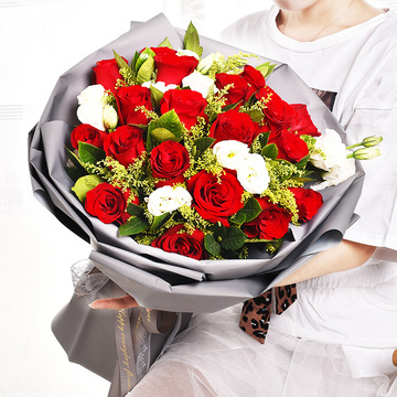 19枝精品红玫瑰,白桔梗丰满间插,黄莺、栀子叶间插