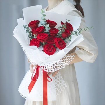 内衬白色雪梨纸+中层白色雾面纸+外层白色圆心网纱包装,红色缎带束扎。花语:想起你的腼腆,还有你的依恋。爱是一种诺言,爱让我们紧紧相连附送:
