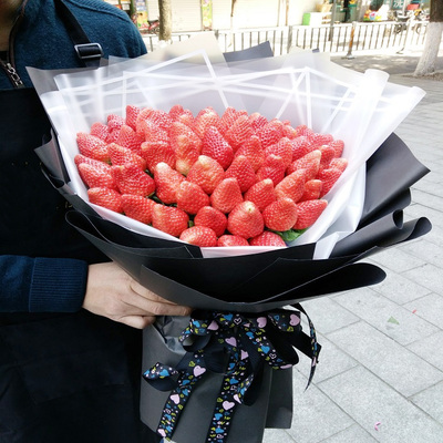 内衬白色雾面纸,外层黑色卡纸扇形包装,黑色花纹丝带蝴蝶结扎束花语:今天又是个灿烂的季节,因为有你,美好的时光它就在眼前附送: