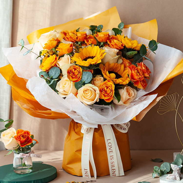 向日葵3枝、香槟玫瑰9枝、橙色泡泡6枝、大叶尤加利