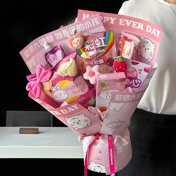 百醇巧克力棒、彩虹软糖、薯片、果冻等粉色系列临时搭配