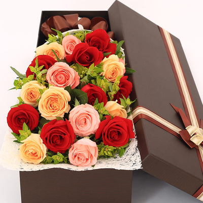 精选8朵红玫瑰,6朵香槟玫瑰,5朵安娜粉玫瑰,叶上黄金(或栀子叶)点缀。