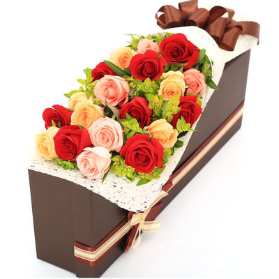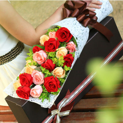 白色落水纸单面包装,深咖色丝带蝴蝶结,高档深咖色礼盒包装。花语:就想这样,肩并肩给你一生的幸福。附送: