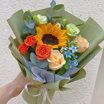 1支向日葵,2朵香槟玫瑰,绿桔梗,橙色芭比,蓝星花、尤加利、喷泉草搭配