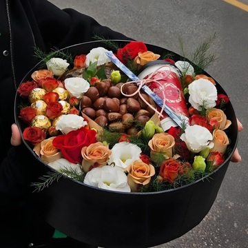 9朵香槟玫瑰,6颗巧克力,2朵红玫瑰,巧克力泡泡,10朵洋桔梗,绿叶,红薯、板栗、奶茶等搭配