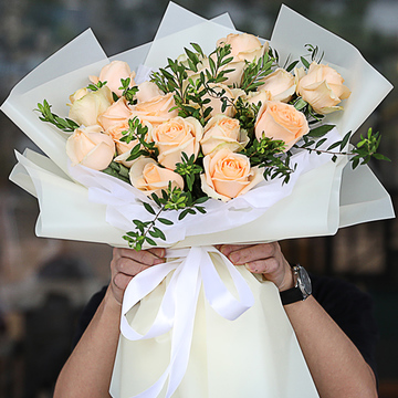 19支香槟玫瑰,搭配适量细叶尤加利叶装饰。