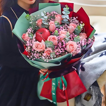 11朵戴安娜粉玫瑰,1个平安果(苹果),粉色满天星丰满,1个灯带