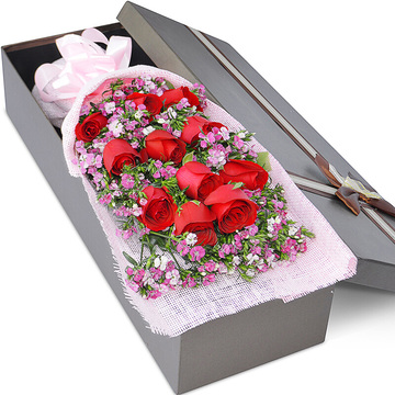 粉色细麻片扇形包装,粉色缎带束扎。长方形礼盒装(颜色随机)花语:是你,让我找到了爱的方向附送:
