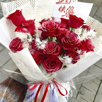 精美包装纸包装,蝴蝶结束扎花语:花儿忍不住清香,鸟儿忍不住飞翔,我忍不住对你的思念。附送:
