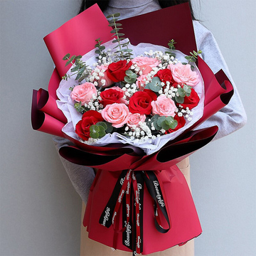7朵红玫瑰,9朵戴安娜粉玫瑰,白色满天星丰满间插,尤加利搭配