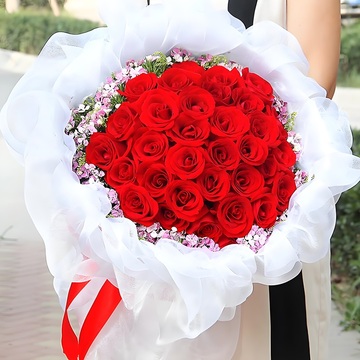 白色瓦楞纸圆形包装,白纱包裹,红色缎带束扎花语:全世界只有个你,叫我如何不珍惜。附送:
