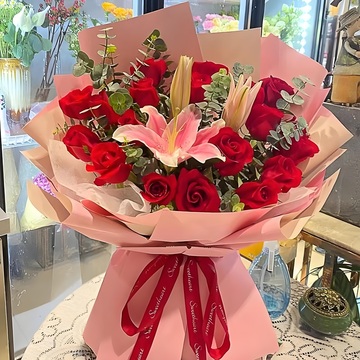 19朵红玫瑰,2枝多头粉百合,尤加利间插