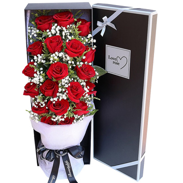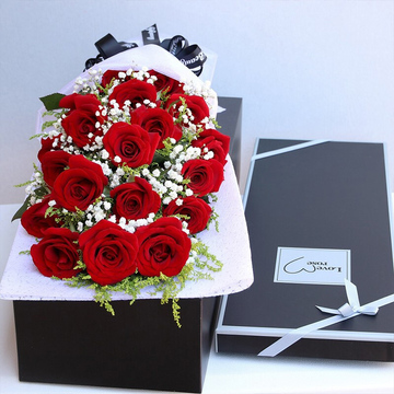 白色落水纸+白色软纱包装,黑色英文缎带束扎花语:宝贝吾爱,我的心与你同在,你的心跳连着我的血脉,即使所有的相思都化为尘埃,我也永不言败。附送: