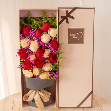 长方形礼盒装(礼盒颜色根据店里安排)花语:一世欢颜,只为你一人绽放,辗转红尘,愿与你同唱一曲地久天长附送: