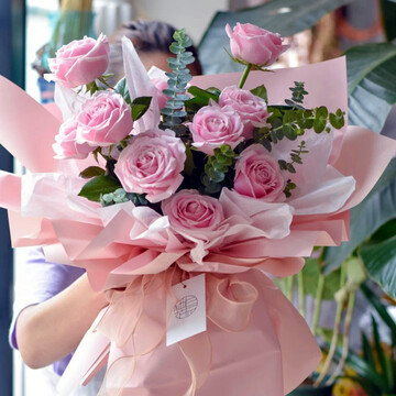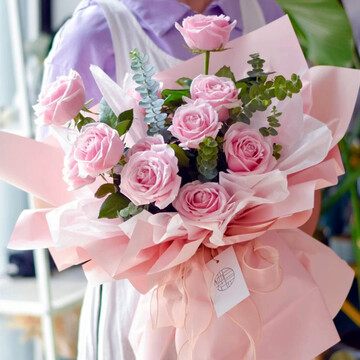 内衬花纹雾面纸,外层粉色珠光纸外包搭配粉色丝带蝴蝶结束扎。花语:青春的岁月里,快乐不在语言中,而是隐藏在我们相视的眼眸中,镶嵌在我们牵手的生活里!附送: