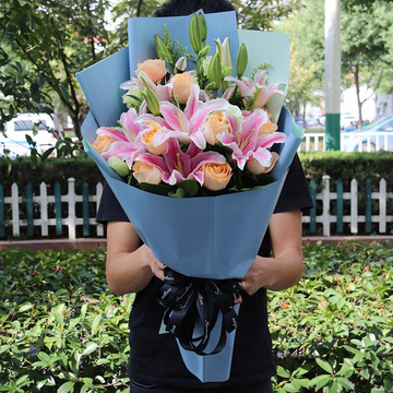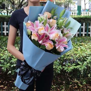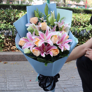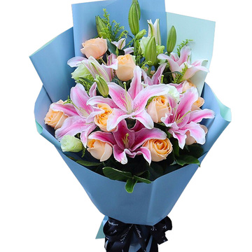 9朵香槟玫瑰,3枝多头粉百合,白色洋桔梗搭配,黄莺、栀子叶点缀