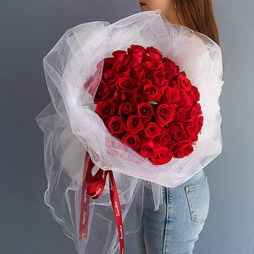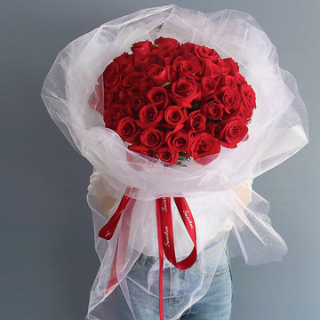 白色韩素纸+白纱包装,红色英文缎带束扎花语:情意绵绵心相牵,日月轮转永不断,情若真挚长相伴,无论海角或天涯,甜蜜温馨驻身边!附送: