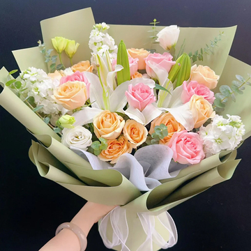 11朵香槟玫瑰,6朵粉佳人玫瑰,2支多头白百合,3支白色紫罗兰,2支多头白桔梗。尤加利搭配