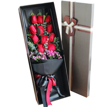 红玫瑰11朵,栀子叶丰满间插,尤加利点缀,粉色石竹梅搭配