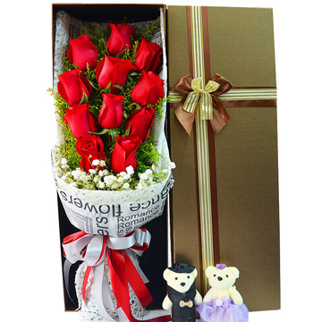 11朵红玫瑰,黄英丰满,白色满天星搭配,一对情侣小熊