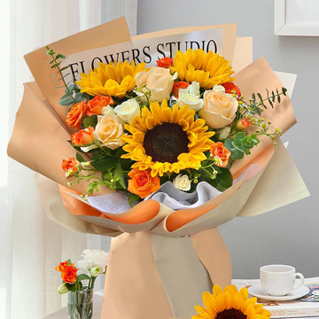 3朵向日葵,5朵香槟玫瑰,3枝多头橙色泡泡玫瑰,1枝多头白色洋桔梗,尤加利叶、小菊点缀