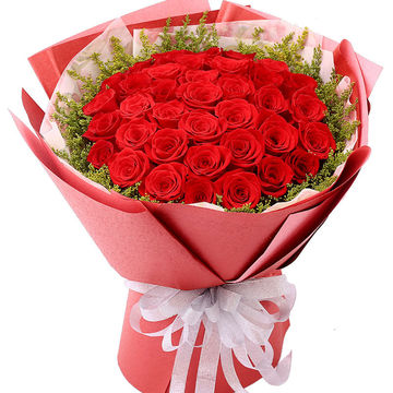 33朵精品红玫瑰,外围搭配适量黄莺