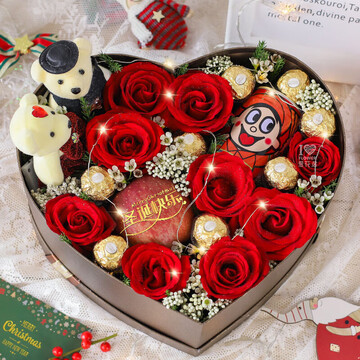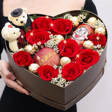9朵红玫瑰,1颗平安果,8颗费列罗巧克力,一瓶旺仔牛奶,1对小熊,配花搭配