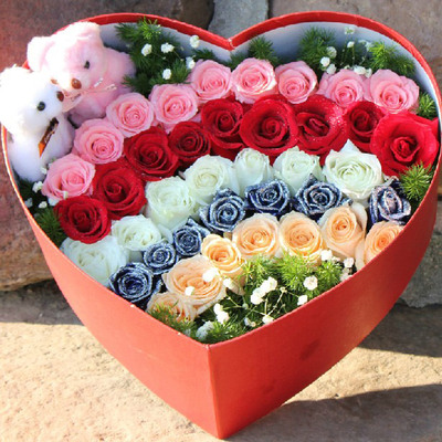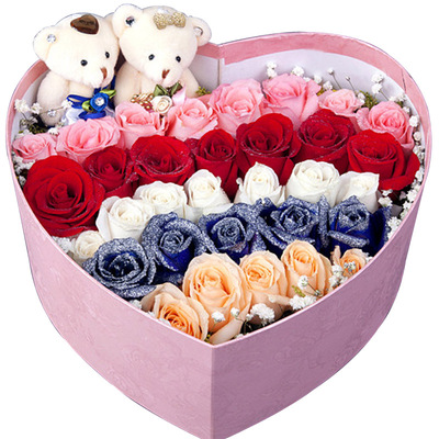 香槟玫瑰、蓝玫瑰、白玫瑰各7朵,红玫瑰、戴安娜玫瑰各9朵,可爱小熊2只