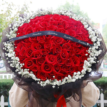 99朵红玫瑰,白色满天星丰满围边,黑色英文缎带搭配