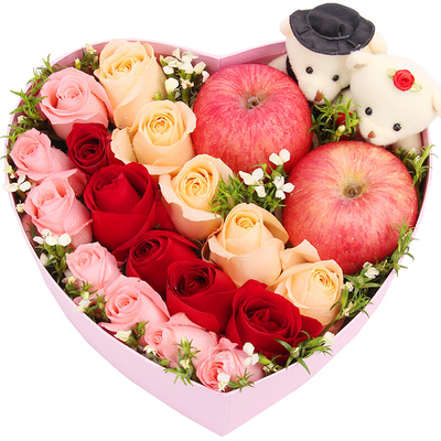 17枝混搭玫瑰(5枝红玫瑰+5枝香槟玫瑰+7枝粉玫瑰),2个苹果,2只小熊,石竹梅搭配。