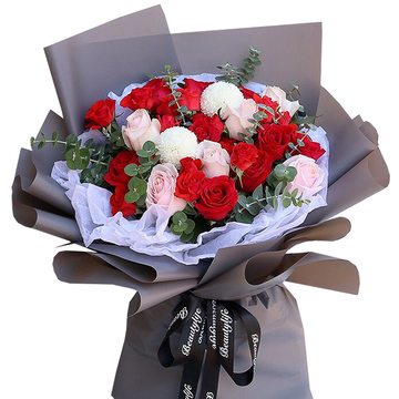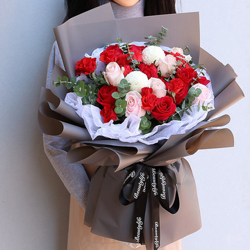 19朵红玫瑰,6朵粉雪山,2支白色乒乓菊,尤加利丰满间插