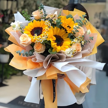 5朵香槟玫瑰,3支向日葵,洋甘菊尤加利等搭配
