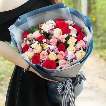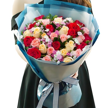 33朵玫瑰(11朵红11朵戴安娜粉11朵香槟),白色及粉色石竹梅丰满搭配,栀子叶间插
