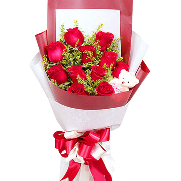 11朵红玫瑰,黄莺丰满间插,一只可爱小熊