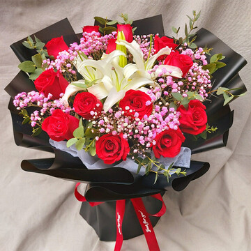 11朵红玫瑰,2枝多头白百合,尤加利间插,粉色满天星丰满