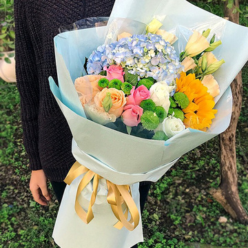 3朵戴安娜3朵香槟玫瑰2朵白玫,1朵蓝绣球,1支向日葵,绿色小菊适量,香槟色桔梗适量