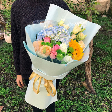 内衬玻璃纸,外层浅蓝色牛皮纸圆形包装,金黄色缎带束扎花语:树木开花等待结果,麦田抽穗等待收获,希望的旋律无处不在,为用心的人们而歌。附送: