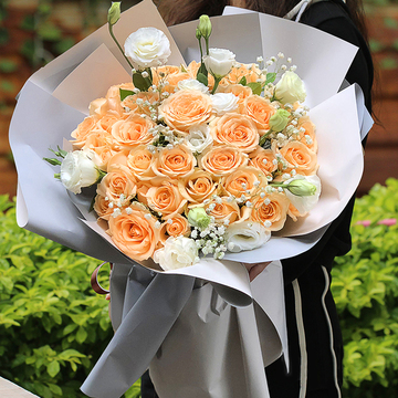精选33枝香槟玫瑰,白桔梗间插,白色满天星点缀