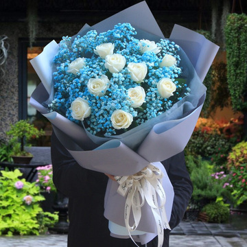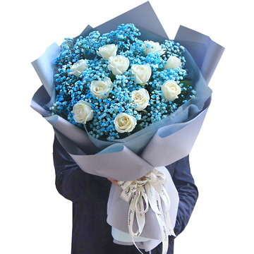 11朵白玫瑰,蓝色满天星丰满,栀子叶搭配