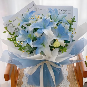 5支碎冰蓝百合,洋桔梗、洋甘菊搭配