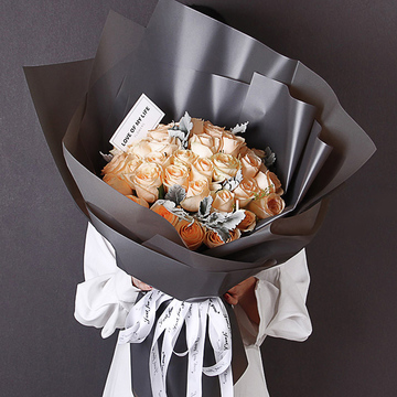 黑色雾面纸韩式包装,白色英文缎带束扎。花语:没有日出时的娇嫩,没有日落时的苍茫,温暖如斯,温暖如你附送: