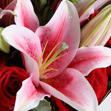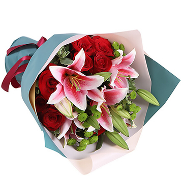 9枝红玫瑰,2枝粉色多头百合,点缀绿色雏菊,高山积雪。