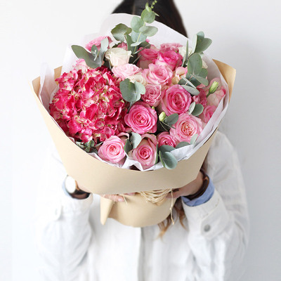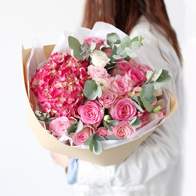 21朵戴安娜玫瑰,1朵红绣球,洋桔梗、尤加利叶搭配。