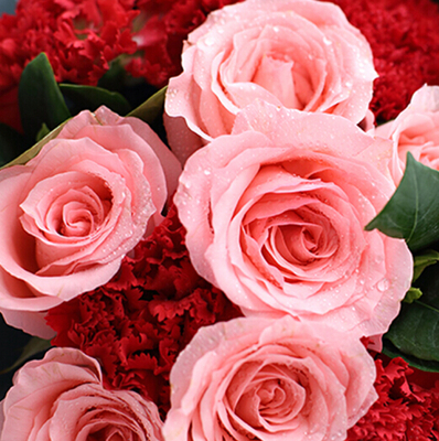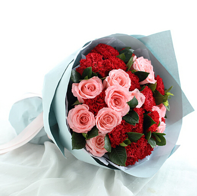 19支红色康乃馨,11支粉玫瑰,栀子叶搭配。