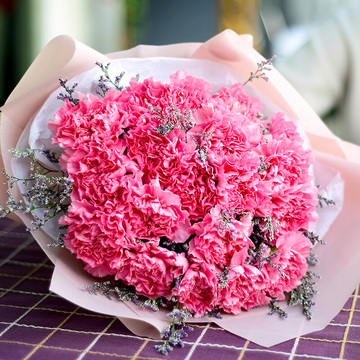 19朵粉色康乃馨,情人草丰满点缀,栀子叶间插