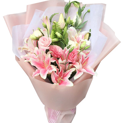 4枝粉色多头百合,4枝粉色多头桔梗,绿色点缀