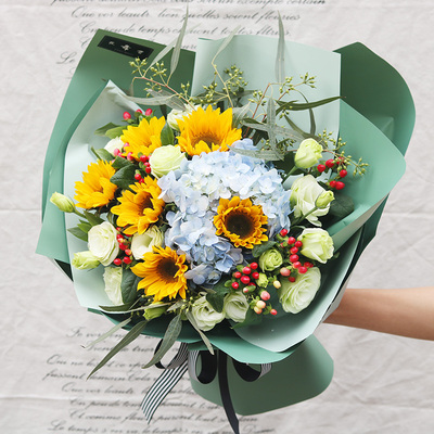 6枝向日葵,桔梗,绣球,相思豆搭配。