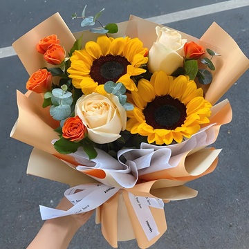 2支向日葵,2朵香槟玫瑰,橙色芭比适量