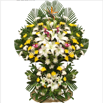 白百合、白菊、黄菊、天堂鸟搭配洋兰、白玫瑰、满天星、黄莺,以散尾葵、鱼尾葵