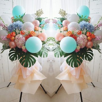 马卡龙色气球(浅蓝色、白色、橘粉色)+粉绣球+蓝绣球+白色洋桔梗+金辉玫瑰,搭配粉色金鱼草、白色满天星、水晶草、翠扇、龟背叶装饰。